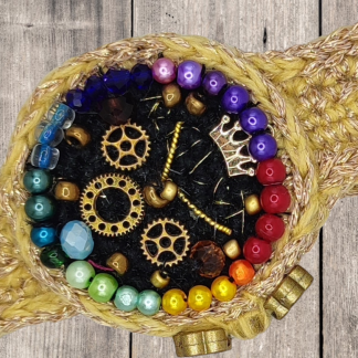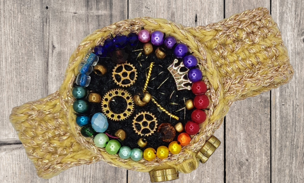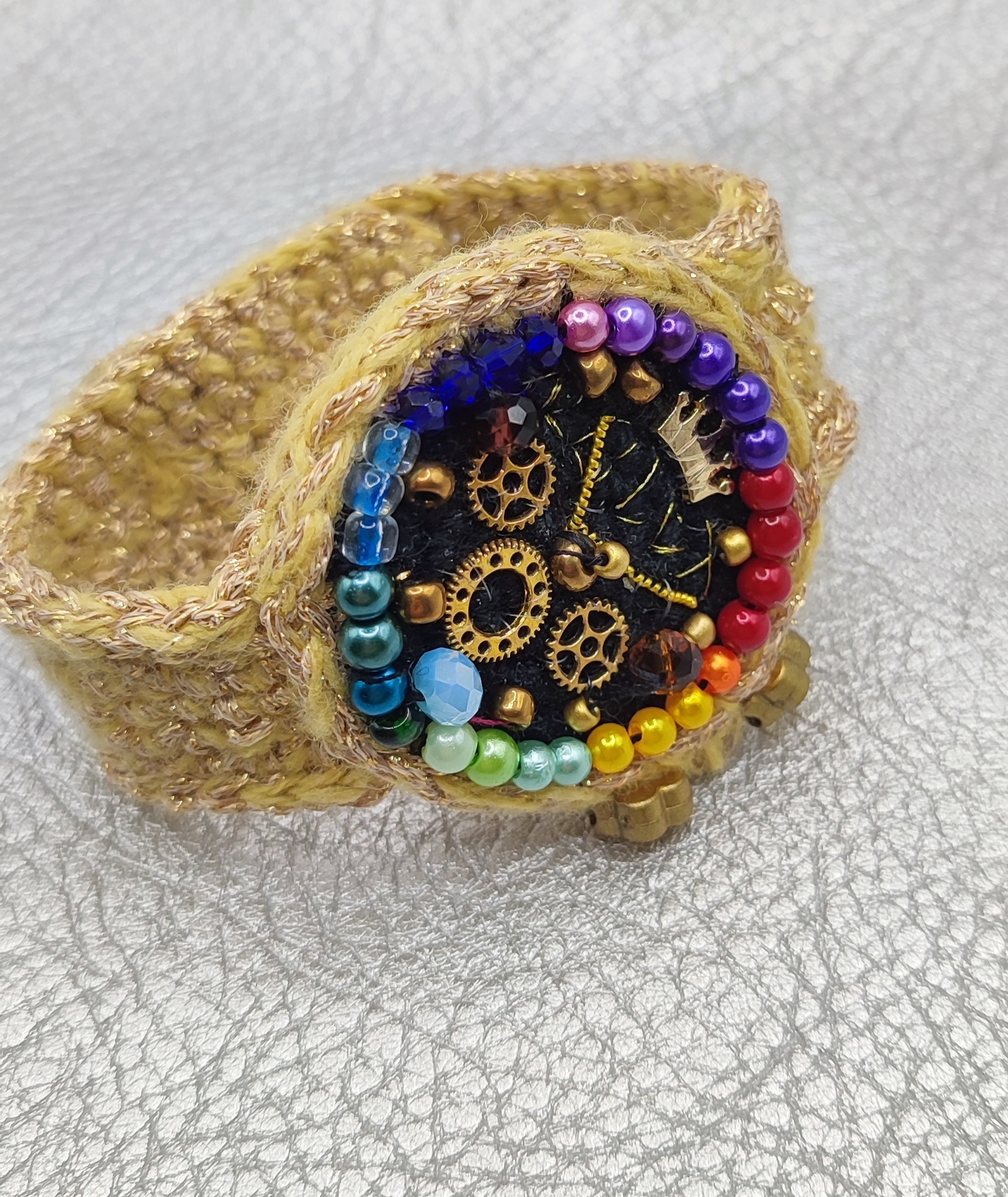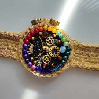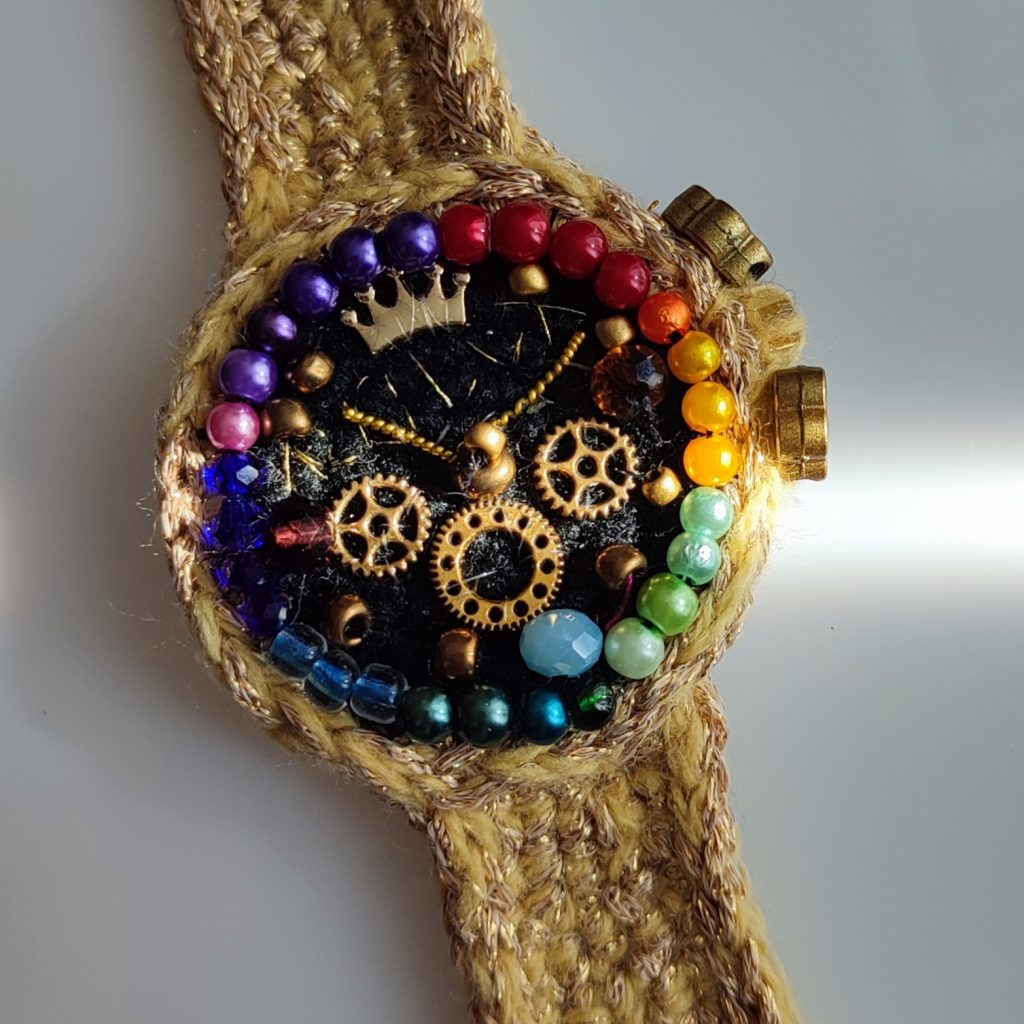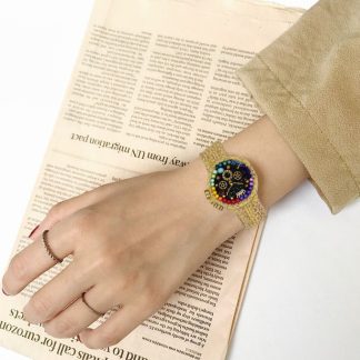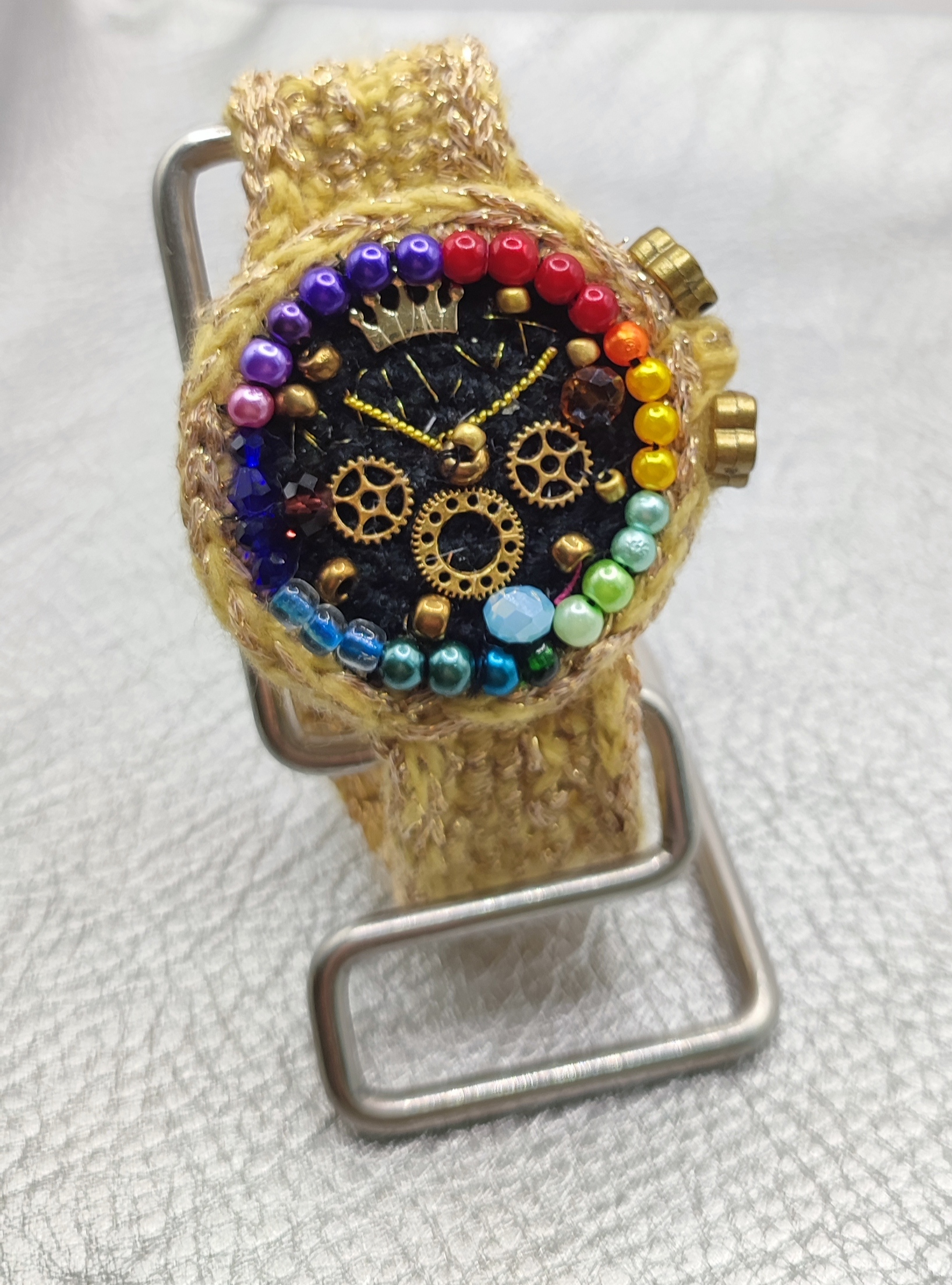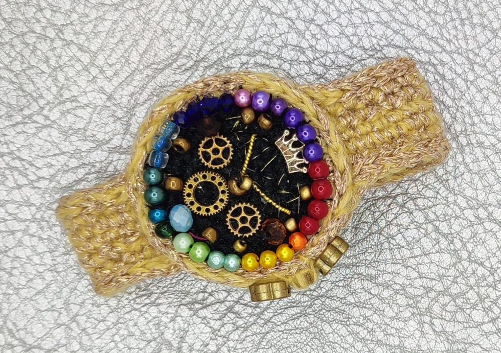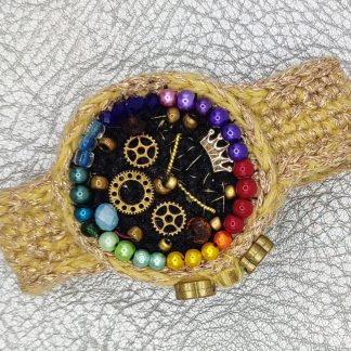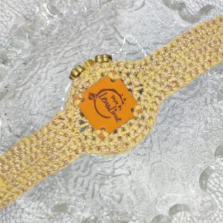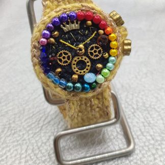 Crafted with meticulous artistry, the Crochet watch is a true masterpiece. This stunning timepiece features intricate crochet work, elevating it to a work of art that stands out in sophistication and uniqueness. Adorned with opulent gold accents and embellished with different colored beads, this watch exudes elegance and charm.