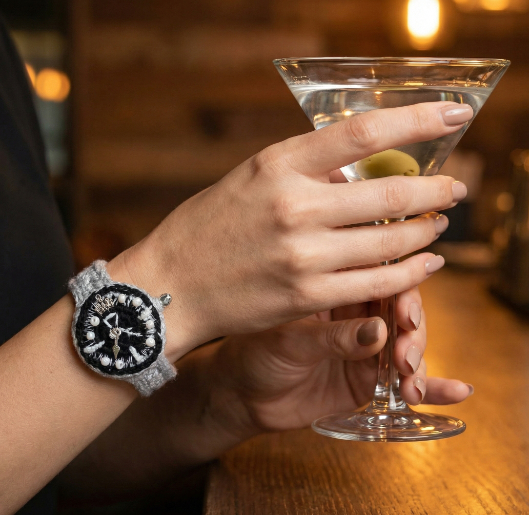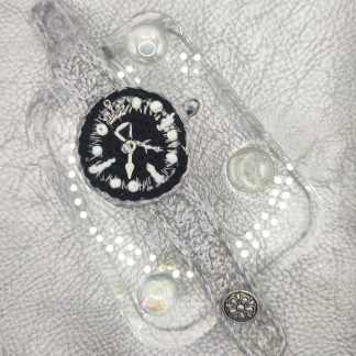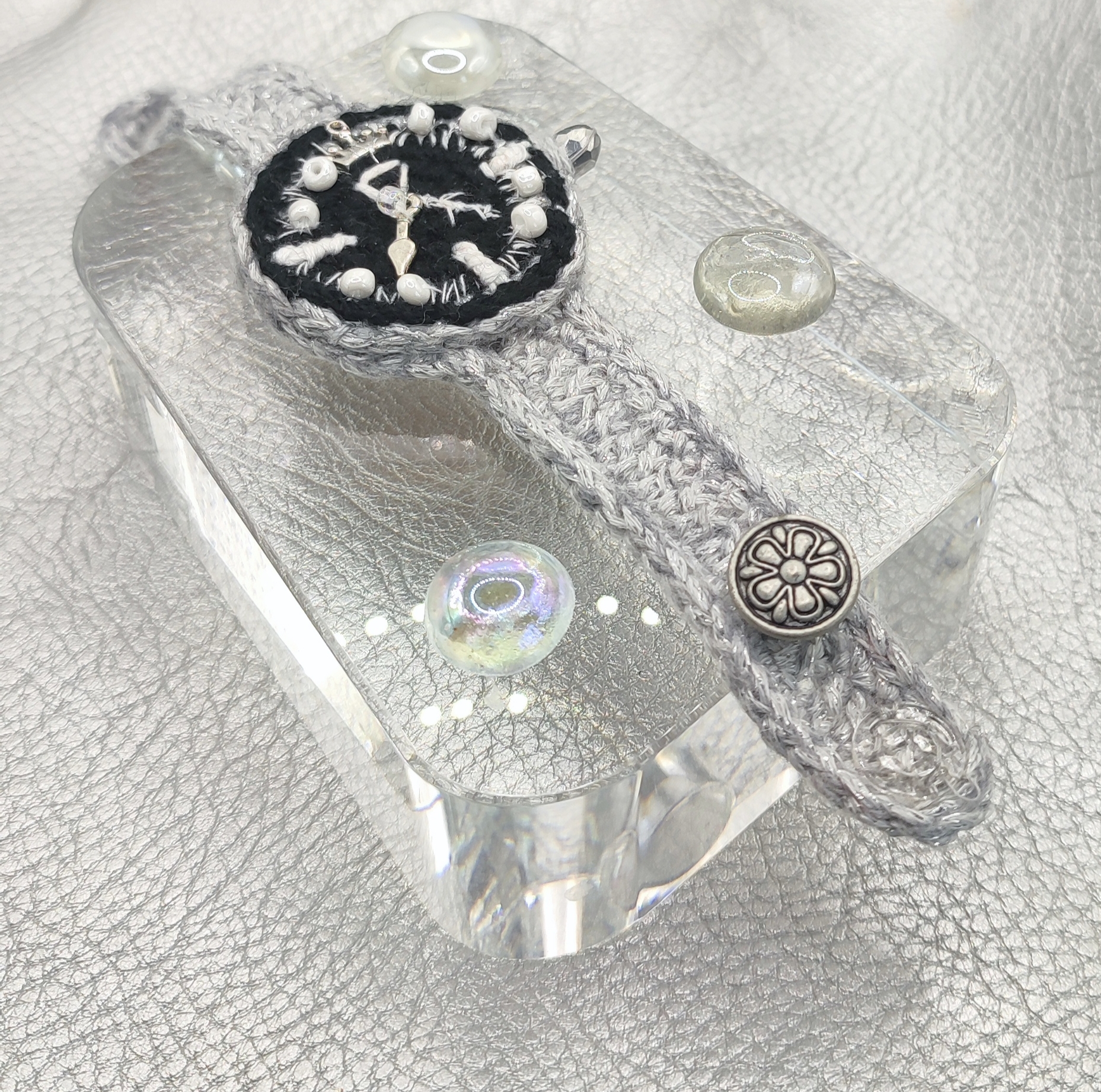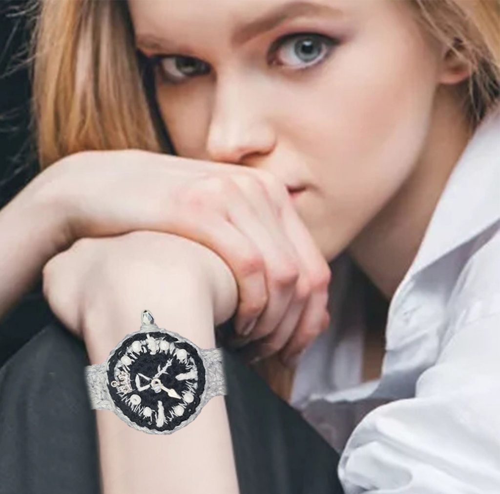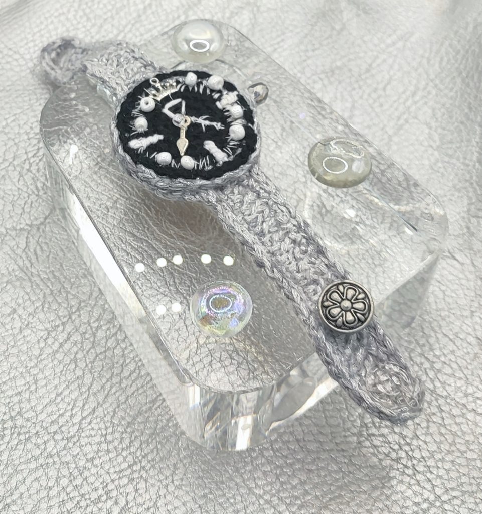 It began as an idea for a gift for her that felt truly unique, something soft and handmade yet bold enough for nights out. The face is framed with white beads and sparking embroidery, giving the dial a dreamy, stitched constellation look. A silvery strap crocheted with lurex yarn adds a quiet glow, while the silver button closure finishes it like vintage jewelry you can actually wear. Slip it on and it feels like a little reminder that time can be beautiful, not just practical.