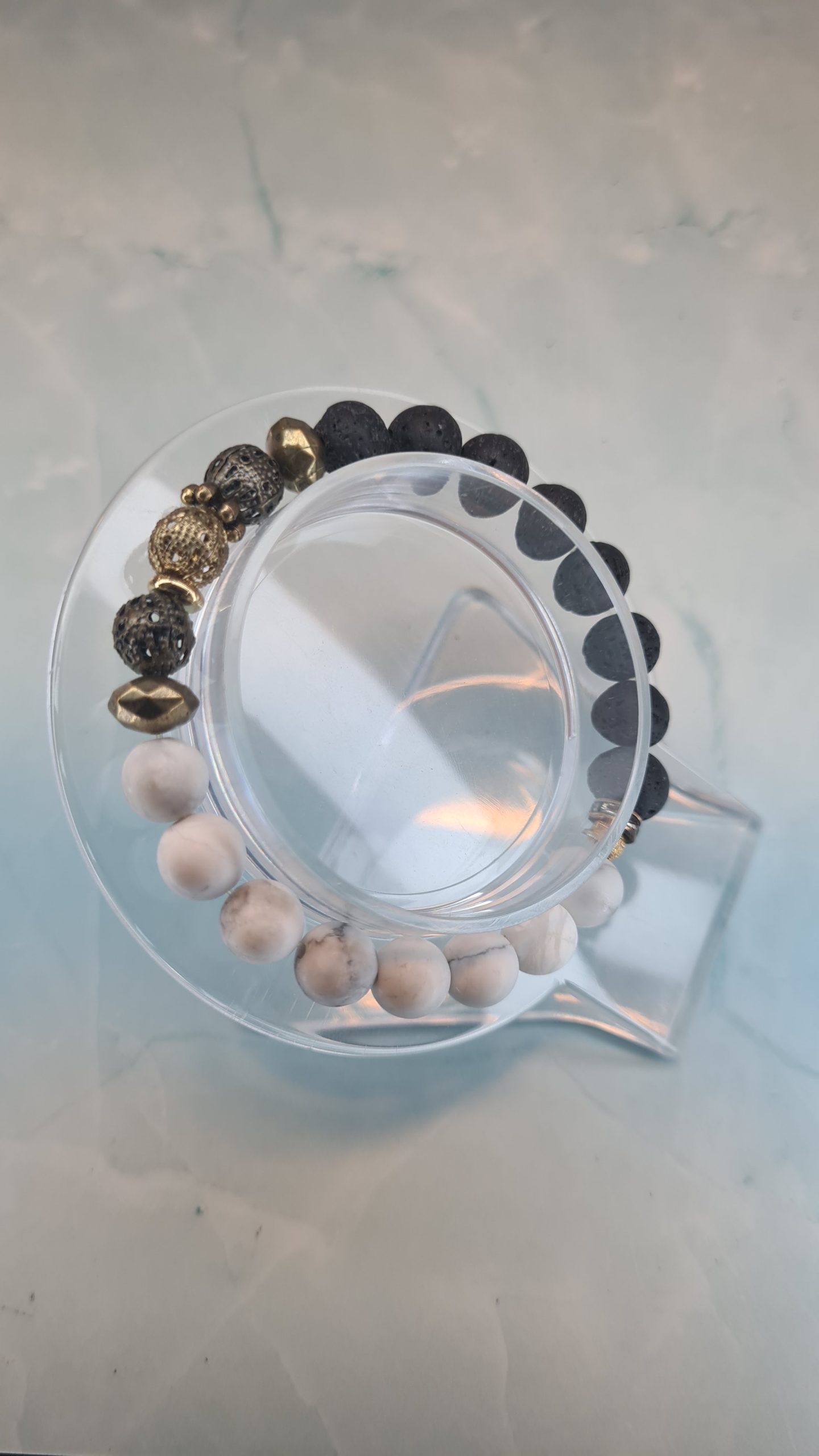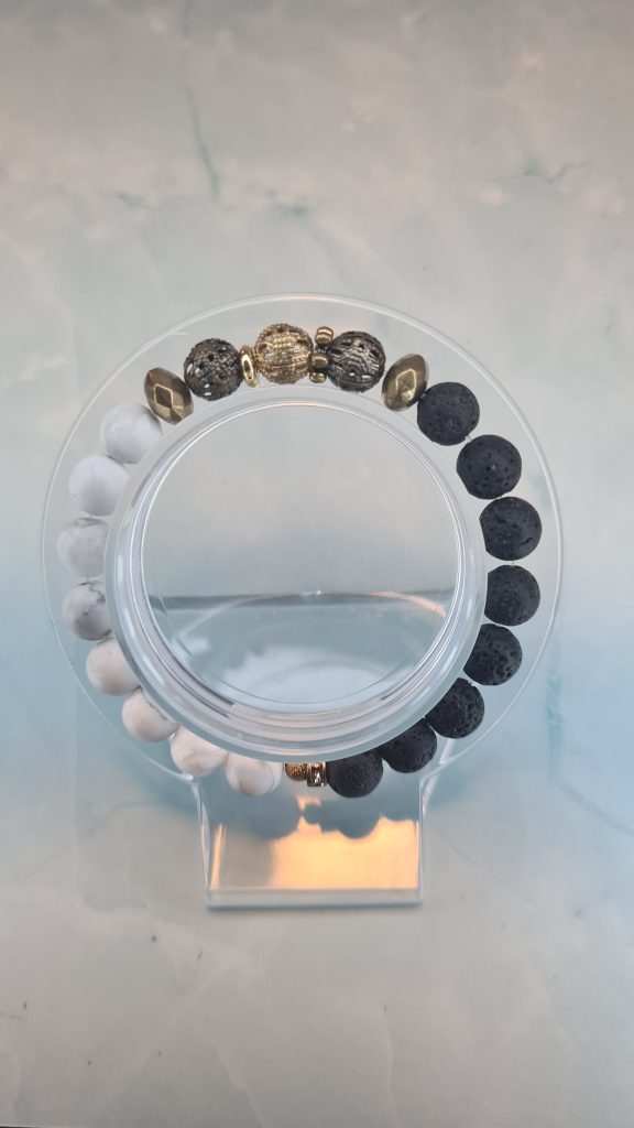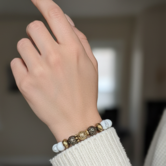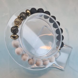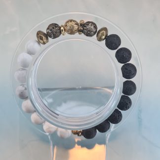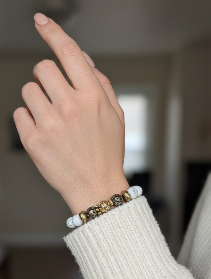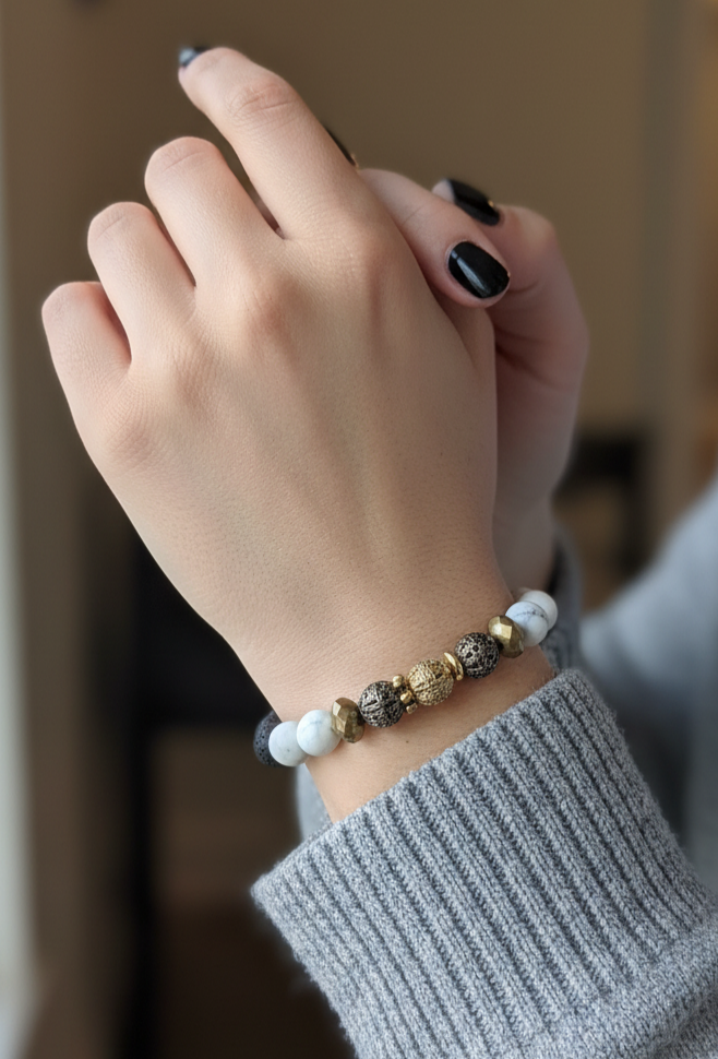 Forest Magic brings together rugged black lava stone and smooth white howlite beads for a bold yet balanced look. Metallic gold and gunmetal accent beads add an earthy, enchanted feel that makes this bracelet truly stand out. Stretchy and easy to wear, it sits beautifully on the wrist whether you're dressing up or keeping it casual.