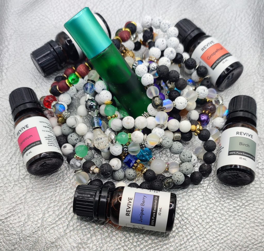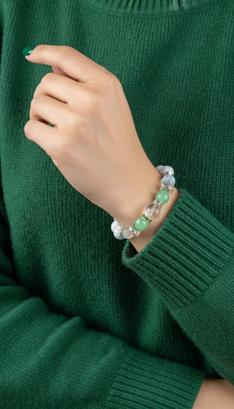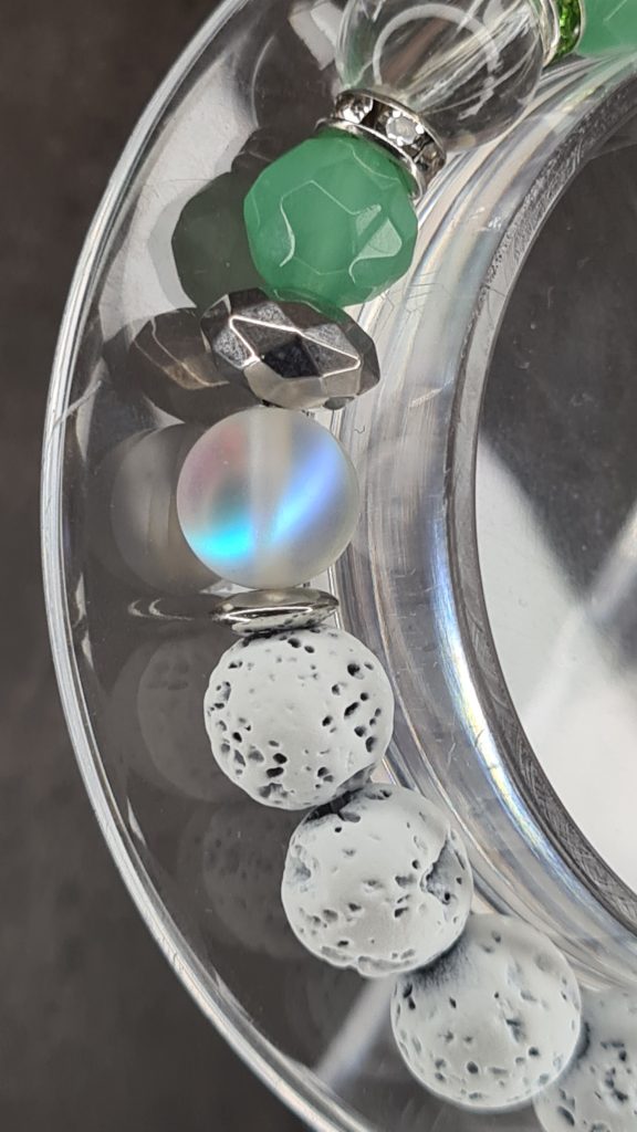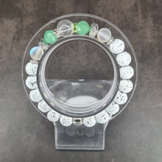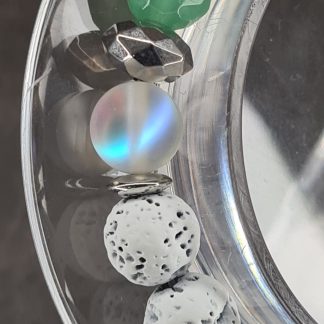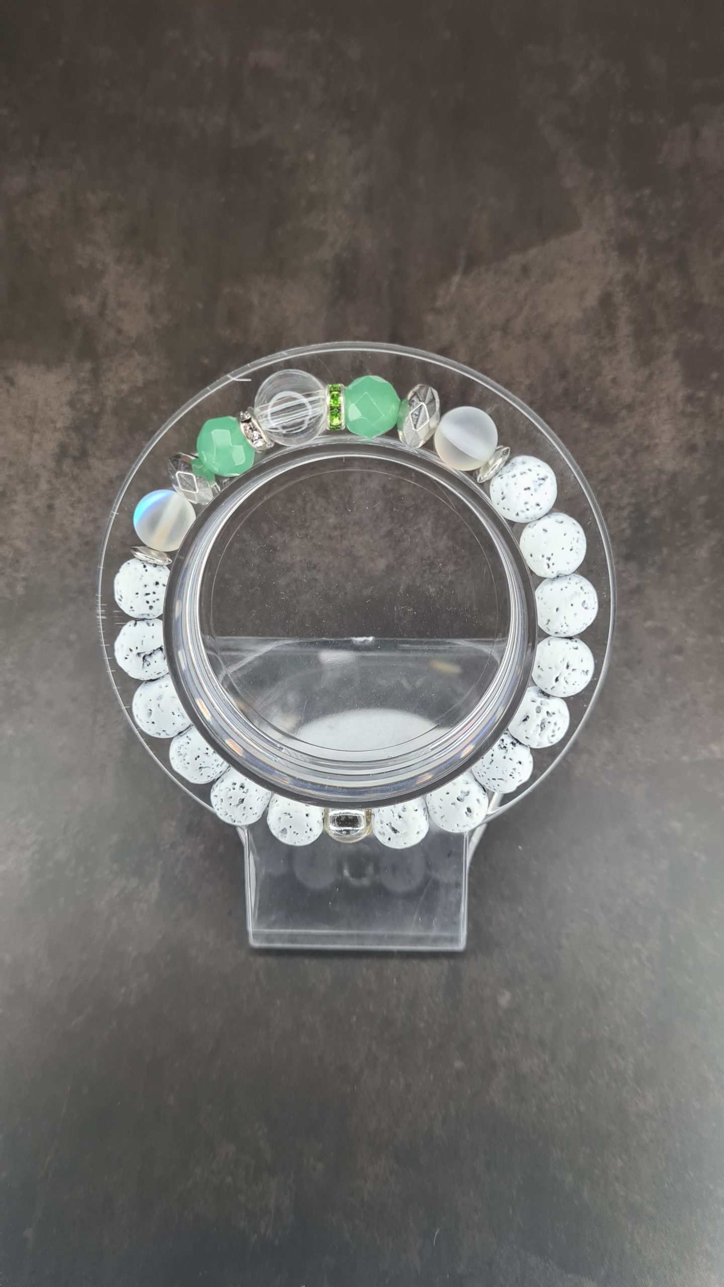 The Green Ice Aromatherapy Diffuser Bracelet pairs cool, calming tones with beautiful mixed beads including green aventurine, clear quartz, moonstone, and speckled lava stone. The lava beads act as a natural diffuser — just add a drop or two of your favorite essential oil and enjoy a subtle, lasting scent throughout your day. Finished with sparkling green rhinestone spacers, this bracelet brings a fresh, polished look that pairs beautifully with cool-toned and earthy outfits alike.