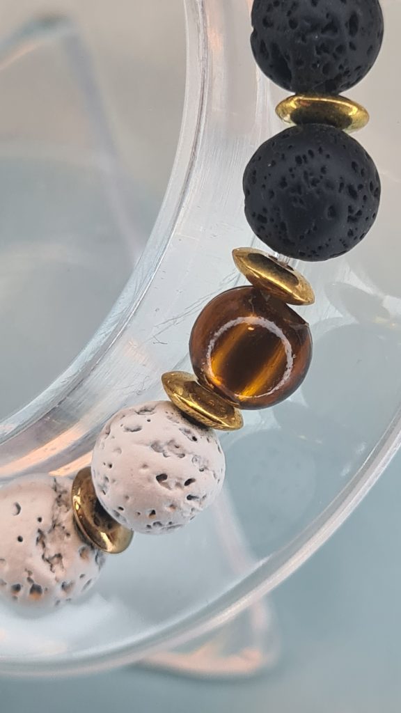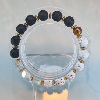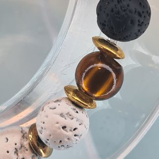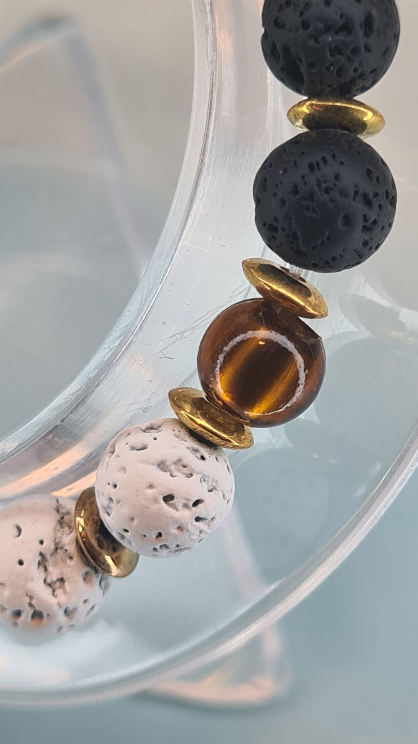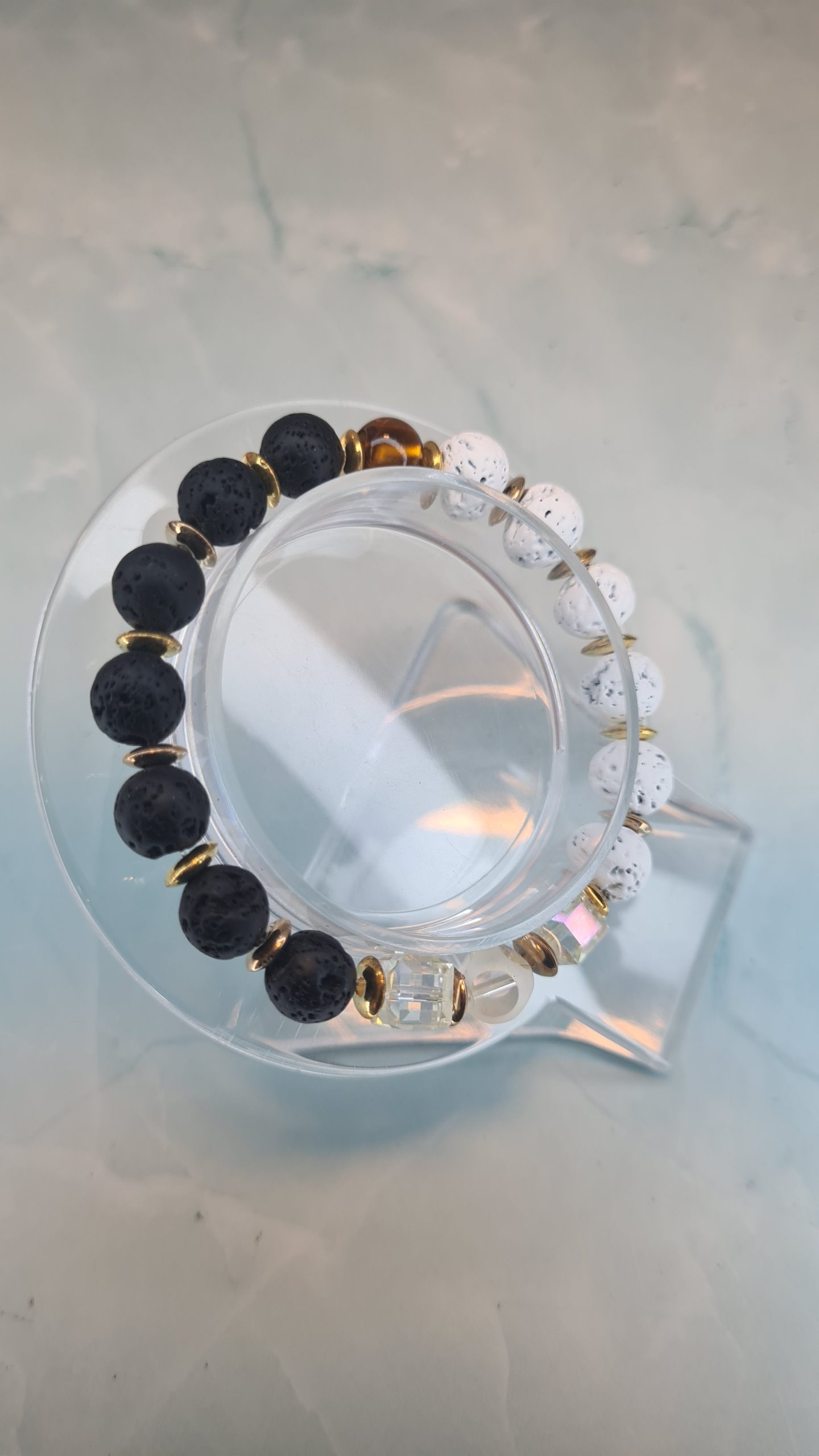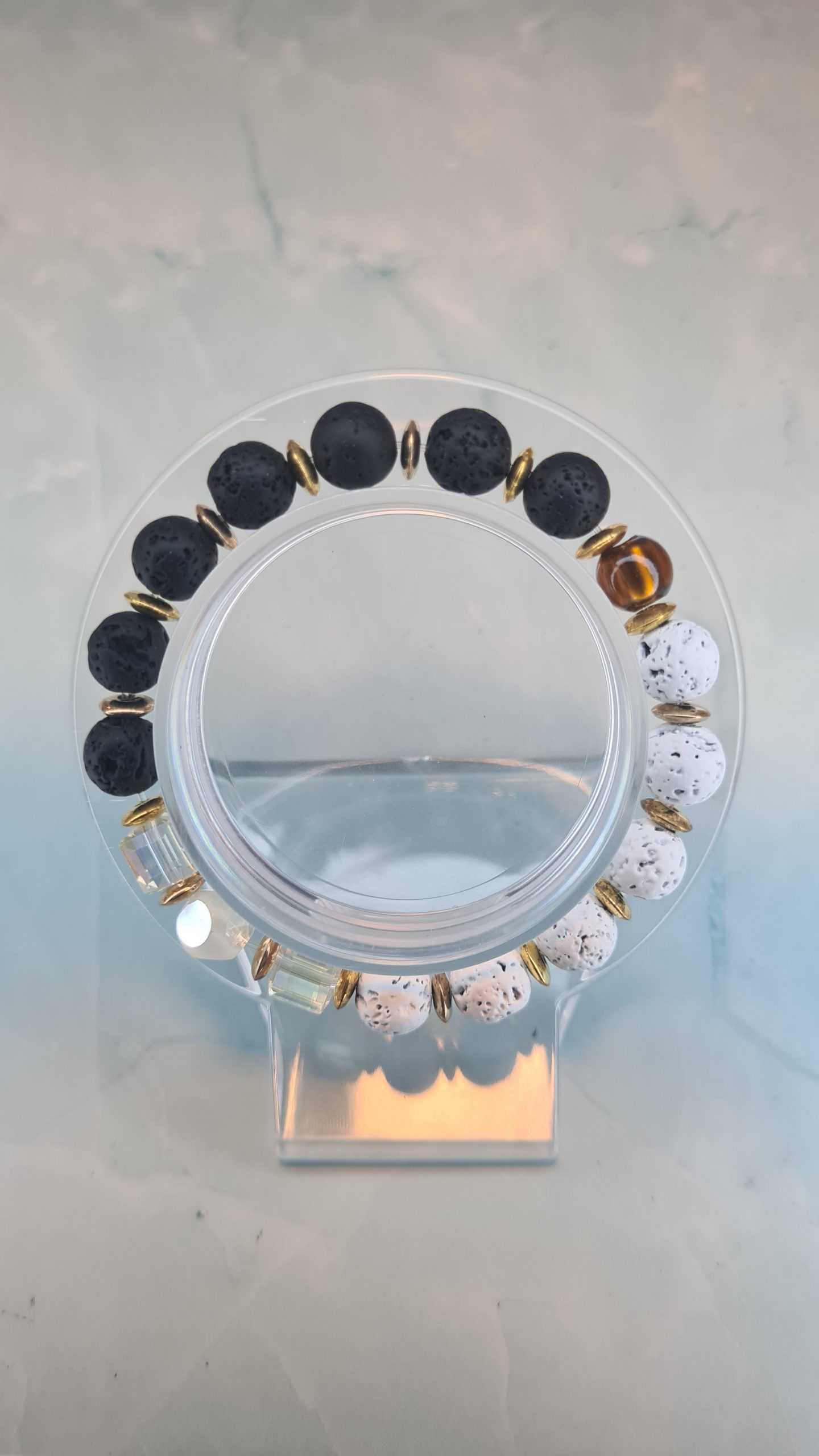 Polar Night captures the striking contrast of deep black lava stone and crisp white speckled beads, separated by warm gold disc spacers for a bold yet balanced look. A faceted clear crystal bead and a rich amber tiger's eye accent bring depth and a touch of warmth to this monochromatic palette. Strung on a sturdy elastic cord, this bracelet slips on effortlessly and suits everyday wear. Whether you layer it or wear it solo, Polar Night makes a confident, understated statement.