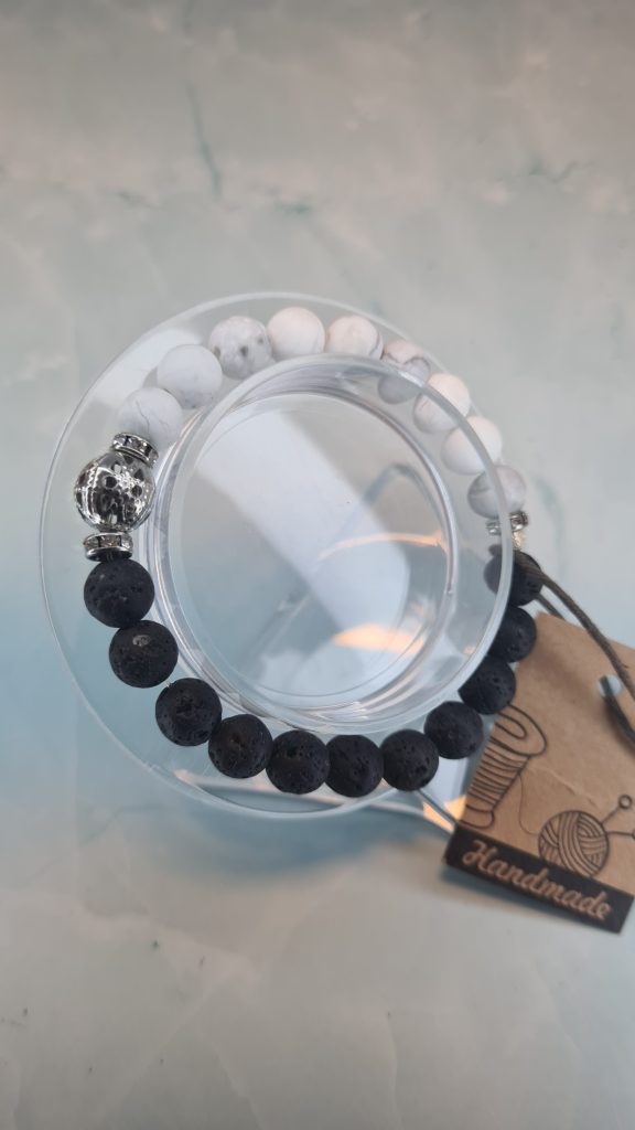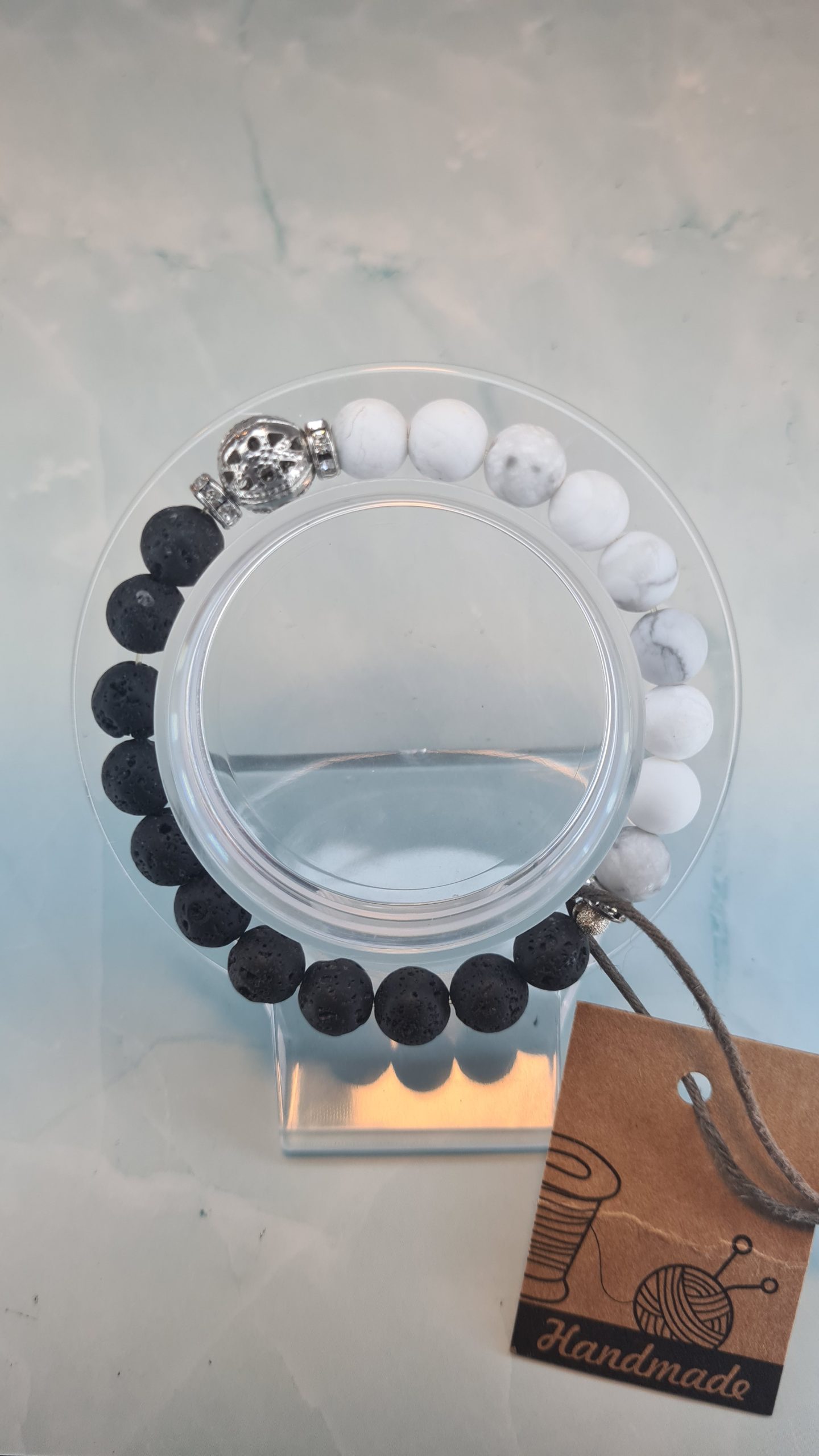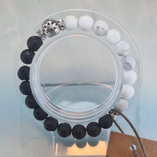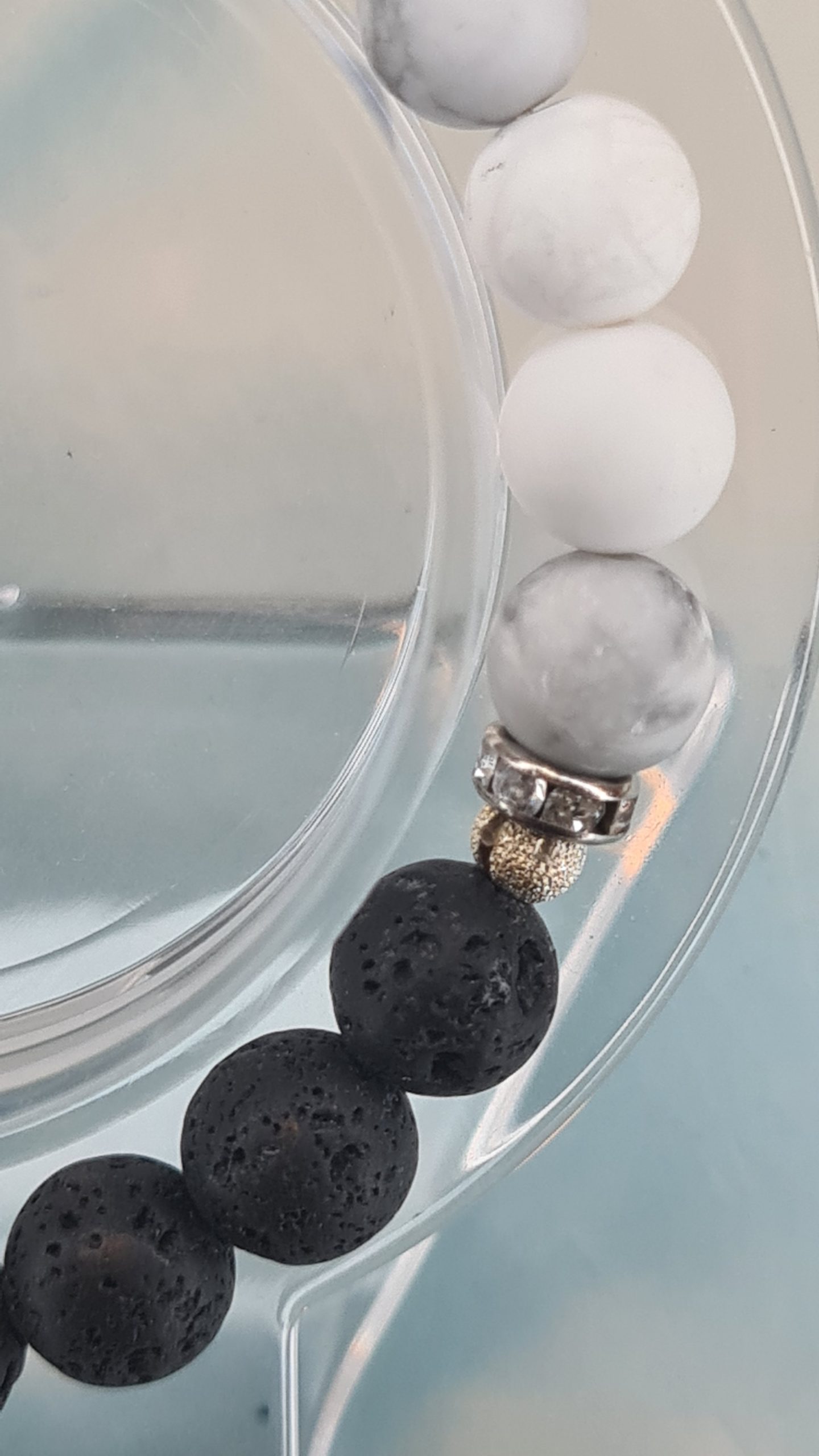 This handcrafted Yin-Yang bracelet beautifully balances matte white howlite beads with rugged black lava stone, crowned by a sparkling silver filigree focal bead. Each piece is strung on elastic for an easy, comfortable fit that suits any wrist. A timeless reminder to carry balance and harmony with you wherever you go.